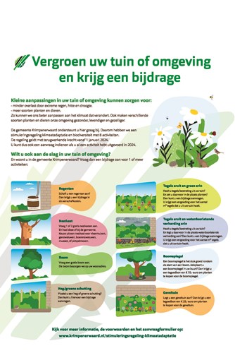 Voor verschillende activiteiten om uw tuin te vergroenen, geldt een stimuleringsregeling. U ontvangt dan van de gemeente een bijdrage. Zo kunt u een regenton laten plaatsen, een nestkast aanvragen of hulp bij een heg of groene schutting aanleggen.