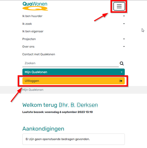 Als u aangemeld bent in het huurdersportaal en u wilt zich afmelden. Dan klikt u rechts bovenin op de drie streepjes en vervolgens op de gele knop "Uitloggen" (Zie onderstaande afbeelding)